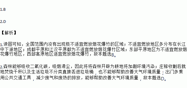 1.B 2.D 【解析】 1.读图可知,全国范围内没有出现极不适宜燃放烟花爆竹的区域;不适宜燃放地区多分布在长江中下游地区;成都平原和江汉平原都为不适宜燃放烟花爆竹区域;东部平原地区为不适宜燃放烟花爆竹地区,西部高原地区适宜燃放烟花爆竹,故本题选B。 2.森林能够吸收二氧化碳,吸烟滞尘,因此将将森林开辟为耕地将加剧环境污染;庄稼收割后就地焚烧千秆以及生活垃圾不分类直接丢进垃...