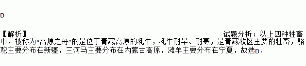 D 【解析】试题分析:以上四种牲畜中,被称为“高原之舟”的是位于青藏高原的牦牛,牦牛耐旱、耐寒,是青藏牧区主要的牲畜,骆驼主要分布在新疆,三河马主要分布在内蒙古高原,滩羊主要分布在宁夏,故选D.