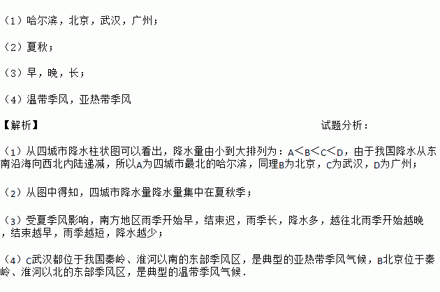 (1)哈尔滨,北京,武汉,广州; (2)夏秋; (3)早,晚,长; (4)温带季风,亚热带季风 【解析】试题分析: (1)从四城市降水柱状图可以看出,降水量由小到大排列为:A<B<C<D,由于我国降水从东南沿海向西北内陆递减,所以A为四城市最北的哈尔滨,同理B为北京,C为武汉,D为广州; (2)从图中得知,四城市降水量降水量集中在夏秋季; (3)受夏季风影...
