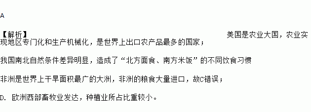 A ¡¾½âÎö¡¿ÃÀ¹úÊÇũҵ´ó¹ú£¬Å©ÒµÊµÏÖµØÇø×¨ÃÅ»¯ºÍÉú²ú»úе»¯£¬ÊÇÊÀ½çÉϳö¿ÚÅ©²úÆ·×î¶àµÄ¹ú¼Ò£» ÎÒ¹úÄϱ±×ÔÈ»Ìõ¼þ²îÒìÃ÷ÏÔ£¬Ôì³ÉÁË¡°±±·½ÃæÊ³¡¢ÄÏ·½Ã×·¹¡±µÄ²»Í¬Òûʳϰ¹ß ·ÇÖÞÊÇÊÀ½çÉϸɺµÃæ»ý×î¹ãµÄ´óÖÞ£¬·ÇÖÞµÄÁ¸Ê³´óÁ¿½ø¿Ú£¬¹ÊC´íÎó£» D. Å·ÖÞÎ÷²¿ÐóÄÁÒµ·¢´ï£¬ÖÖÖ²ÒµËùÕ¼±ÈÖØ½ÏС¡£