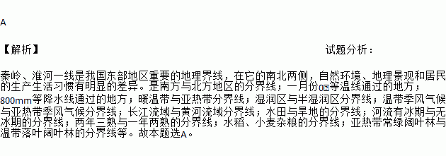A 【解析】试题分析: 秦岭、淮河一线是我国东部地区重要的地理界线,在它的南北两侧,自然环境、地理景观和居民的生产生活习惯有明显的差异。是南方与北方地区的分界线;一月份0℃等温线通过的地方;800mm等降水线通过的地方;暖温带与亚热带分界线;湿润区与半湿润区分界线;温带季风气候与亚热带季风气候分界线;长江流域与黄河流域分界线;水田与旱地的分界线;河流有冰期与无冰期的分界线;两年三熟与一...
