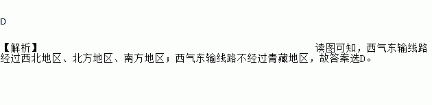 D 【解析】读图可知,西气东输线路经过西北地区、北方地区、南方地区;西气东输线路不经过青藏地区,故答案选D。
