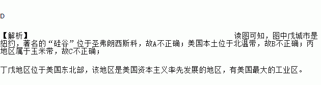D 【解析】读图可知,图中戊城市是纽约,著名的“硅谷”位于圣弗朗西斯科,故A不正确;美国本土位于北温带,故B不正确;丙地区属于玉米带,故C不正确; 丁戊地区位于美国东北部,该地区是美国资本主义率先发展的地区,有美国最大的工业区。