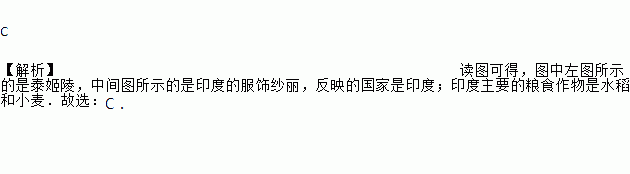 C 【解析】读图可得,图中左图所示的是泰姬陵,中间图所示的是印度的服饰纱丽,反映的国家是印度;印度主要的粮食作物是水稻和小麦.故选:C.