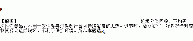 B ¡¾½âÎö¡¿À¬»ø·ÖÀà»ØÊÕ£¬²»¹ºÂòÒ»´ÎÐÔÏû·ÑÆ·£¬²»ÓÃÒ»´ÎÐԲ;߽ø²Í¶¼·ûºÏ¿É³ÖÐø·¢Õ¹µÄ˼Ïë¡£¹ý½Úʱ£¬¸øÅóÓÑдÁËºÃ¶àºØ¿¨¶ÔÉÁÖ×ÊÔ´»áÔì³ÉÆÆ»µ£¬²»ÀûÓÚ±£»¤»·¾³¡£ËùÒÔ±¾ÌâÑ¡B¡£