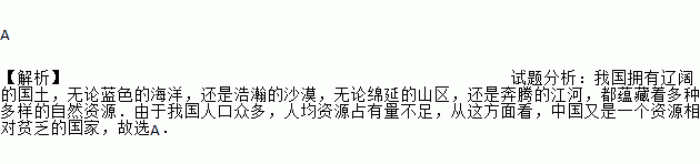 A 【解析】试题分析:我国拥有辽阔的国土,无论蓝色的海洋,还是浩瀚的沙漠,无论绵延的山区,还是奔腾的江河,都蕴藏着多种多样的自然资源.由于我国人口众多,人均资源占有量不足,从这方面看,中国又是一个资源相对贫乏的国家,故选A.
