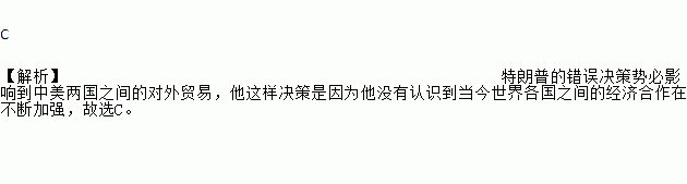 C 【解析】特朗普的错误决策势必影响到中美两国之间的对外贸易,他这样决策是因为他没有认识到当今世界各国之间的经济合作在不断加强,故选C。