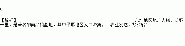 C 【解析】东北地区地广人稀,沃野千里,是著名的商品粮基地,其中平原地区人口密集,工农业发达,故C符合。