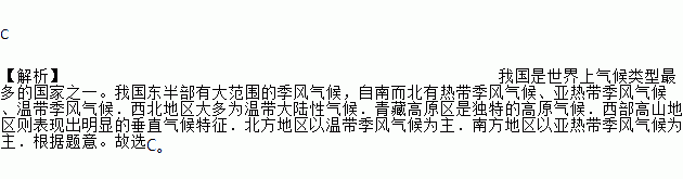C 【解析】我国是世界上气候类型最多的国家之一。我国东半部有大范围的季风气候,自南而北有热带季风气候、亚热带季风气候、温带季风气候.西北地区大多为温带大陆性气候.青藏高原区是独特的高原气候.西部高山地区则表现出明显的垂直气候特征.北方地区以温带季风气候为主.南方地区以亚热带季风气候为主.根据题意。故选C。