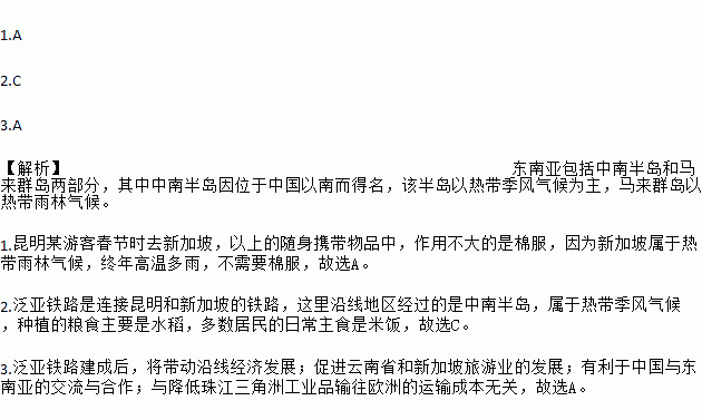1.A 2.C 3.A ¡¾½âÎö¡¿¶«ÄÏÑǰüÀ¨ÖÐÄϰ뵺ºÍÂíÀ´ÈºµºÁ½²¿·Ö£¬ÆäÖÐÖÐÄϰ뵺ÒòλÓÚÖйúÒÔÄ϶øµÃÃû£¬¸Ã°ëµºÒÔÈÈ´ø¼¾·çÆøºòΪÖ÷£¬ÂíÀ´ÈºµºÒÔÈÈ´øÓêÁÖÆøºò¡£ 1.À¥Ã÷ijÓοʹº½ÚʱȥÐÂ¼ÓÆÂ£¬ÒÔÉϵÄËæÉíЯ´øÎïÆ·ÖУ¬×÷Óò»´óµÄÊÇÃÞ·þ£¬ÒòΪÐÂ¼ÓÆÂÊôÓÚÈÈ´øÓêÁÖÆøºò£¬ÖÕÄê¸ßζàÓ꣬²»ÐèÒªÃÞ·þ£¬¹ÊÑ¡A¡£ 2.·ºÑÇÌú·ÊÇÁ¬½ÓÀ¥Ã÷ºÍÐÂ¼ÓÆÂµÄÌú·£¬ÕâÀïÑØÏßµØÇø¾¹ýµÄÊÇÖÐÄϰ뵺£¬ÊôÓÚÈÈ´ø¼¾·çÆø...