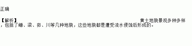 黄土地貌景观多种多样,?、梁、峁、川等是遭受流水侵蚀后形成的。( )