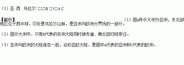 (1)图中A是______洲,其东北部地区位于______(东、西)半球;①处是与另一大洲的分界山脉——_______山脉。