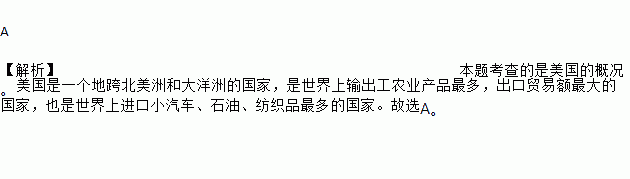 A ¡¾½âÎö¡¿±¾Ì⿼²éµÄÊÇÃÀ¹úµÄ¸Å¿ö¡£ÃÀ¹úÊÇÒ»¸öµØ¿ç±±ÃÀÖ޺ʹóÑóÖ޵Ĺú¼Ò£¬ÊÇÊÀ½çÉÏÊä³ö¹¤Å©Òµ²úÆ·×î¶à£¬³ö¿ÚóÒ×¶î×î´óµÄ¹ú¼Ò£¬Ò²ÊÇÊÀ½çÉϽø¿ÚСÆû³µ¡¢Ê¯ÓÍ¡¢·Ä֯Ʒ×î¶àµÄ¹ú¼Ò¡£¹ÊÑ¡A¡£