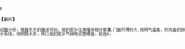 冬冬的班级来了一名新同学,他在自我介绍时说道,我家乡的住房墙体相对单薄,门窗开得较大,并建有较完备的排水系统。你认为他家乡的自然环境特点是。