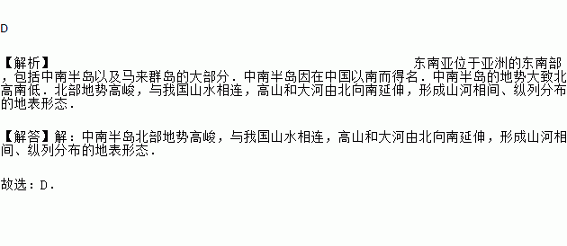 D 【解析】东南亚位于亚洲的东南部,包括中南半岛以及马来群岛的大部分.中南半岛因在中国以南而得名.中南半岛的地势大致北高南低.北部地势高峻,与我国山水相连,高山和大河由北向南延伸,形成山河相间、纵列分布的地表形态. 【解答】【解析】 中南半岛北部地势高峻,与我国山水相连,高山和大河由北向南延伸,形成山河相间、纵列分布的地表形态. 故选:D.