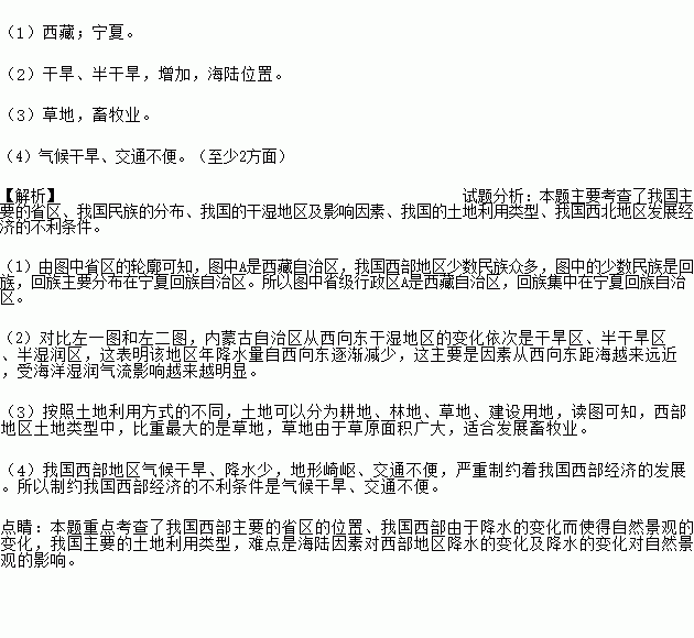 (2)对比左一图和左二图,内蒙古自治区从西向东干湿地区的变化依次是 区、_____区