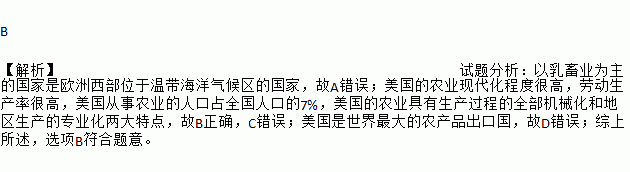 B 【解析】试题分析:以乳畜业为主的国家是欧洲西部位于温带海洋气候区的国家,故A错误;美国的农业现代化程度很高,劳动生产率很高,美国从事农业的人口占全国人口的7%,美国的农业具有生产过程的全部机械化和地区生产的专业化两大特点,故B正确,C错误;美国是世界最大的农产品出口国,故D错误;综上所述,选项B符合题意。