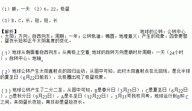 (1)顺,一天 (2)6,22,极昼 (3)B,C,长,短,短,长 【解析】地球的公转:公转中心:太阳;方向:自西向东;周期:一年;公转轨道:椭圆。地理意义:产生的现象:四季更替、昼夜长短和正午太阳高度的变化。 (1)地球从侧面看自西向东;从南极上空看, 地球的自转方向是顺时针周期:一天(24小时);自转中心:地轴。 (2)地球公转产生太阳直射点的回归运动,从图中可知,此时...