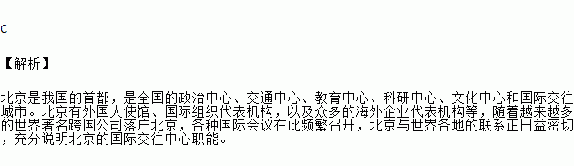 “北京有外国大使馆、国际组织代表机构,以及众多的海外企业代表机构等,随着越来越多的世界著名跨国公司落户北京,各种国际会议在此频繁召开,北京与世界各地的联系正日益密切”。这段文字体现的北京城市职能是