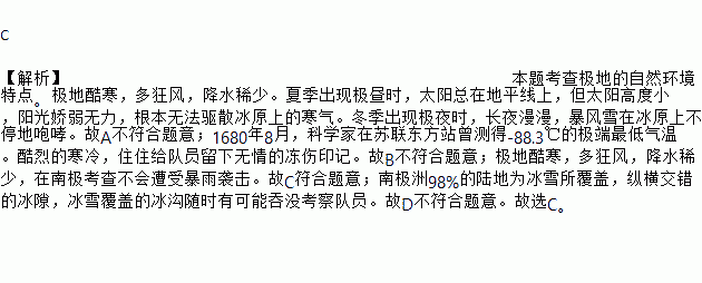 C 【解析】本题考查极地的自然环境特点。极地酷寒,多狂风,降水稀少。夏季出现极昼时,太阳总在地平线上,但太阳高度小,阳光娇弱无力,根本无法驱散冰原上的寒气。冬季出现极夜时,长夜漫漫,暴风雪在冰原上不停地咆哮。故A不符合题意;1680年8月,科学家在苏联东方站曾测得-88.3℃的极端最低气温。酷烈的寒冷,住住给队员留下无情的冻伤印记。故B不符合题意;极地酷寒,多狂风,降水稀少,在南极考查不会遭...