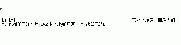 B 【解析】东北平原是我国最大的平原,包括①三江平原;②松嫩平原;④辽河平原,故答案选B.