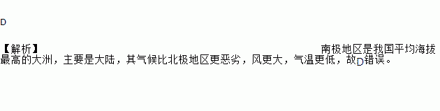 D ¡¾½âÎö¡¿Äϼ«µØÇøÊÇÎÒ¹úƽ¾ùº£°Î×î¸ßµÄ´óÖÞ£¬Ö÷ÒªÊǴ󽣬ÆäÆøºò±È±±¼«µØÇø¸ü¶ñÁÓ£¬·ç¸ü´ó£¬ÆøÎ¸üµÍ£¬¹ÊD´íÎó¡£