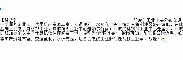 D 【解析】印度的工业主要分布在德干高原的东北部,这里矿产资源丰富,交通便利,水源充足等;恒河三角洲地区盛产黄麻,在此基础上发展了麻纺织工业,其麻纺织工业中心是加尔各答;印度的棉纺织工业中心是孟买,印度的班加罗尔以生产计算机软件而闻名于世,被称为“南亚硅谷”.读图可知,加尔各答附近煤、铁等矿产资源丰富,交通便利,水源充足,适合发展的工业部门是钢铁工业等。故选:D。