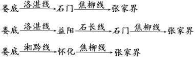 (4)他们还筹划从娄底乘火车去张家界武陵源风景区考察,请为他们设计一条近便的出行路线。