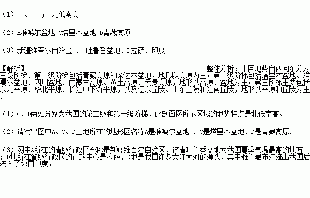 (1)C、D两处分别为我国的第 级和第 级阶梯,此剖面图所示区域的地势特点是 。
