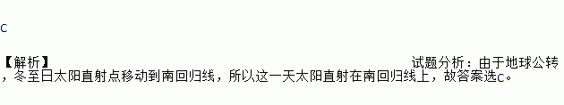C 【解析】试题分析:由于地球公转,冬至日太阳直射点移动到南回归线,所以这一天太阳直射在南回归线上,故答案选C。