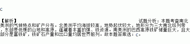 C 【解析】试题分析:本题考查南北美洲的气候特点和矿产分布。北美洲平均海拔较高,地势起伏较大,地形分为三大南北纵列带,东部是低缓的山地和高原,蕴藏着丰富的煤、铁资源。南美洲的巴西高原铁矿储量巨大,且大部分是富铁矿,铁矿石产量和出口量均居世界前列。故本题答案选:C。