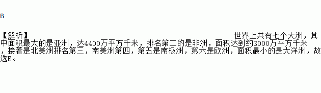 B 【解析】世界上共有七个大洲,其中面积最大的是亚洲,达4400万平方千米,排名第二的是非洲,面积达到约3000万平方千米,接着是北美洲排名第三,南美洲第四,第五是南极洲,第六是欧洲,面积最小的是大洋洲,故选B。