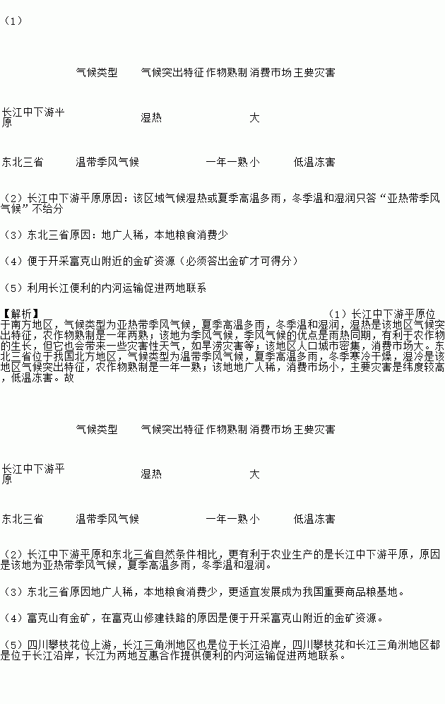 (2)根据上表及图文资料,长江中下游平原和东北三省自然条件相比,更有利于农业生产的是 ,原因是 。