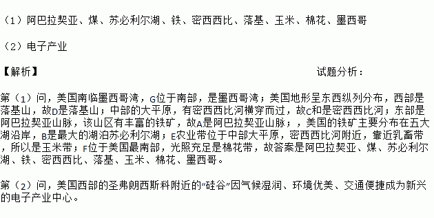 (1)阿巴拉契亚、煤、苏必利尔湖、铁、密西西比、落基、玉米、棉花、墨西哥 (2)电子产业 【解析】试题分析: 第(1)问,美国南临墨西哥湾,G位于南部,是墨西哥湾;美国地形呈东西纵列分布,西部是落基山,故D是落基山;中部的大平原,有密西西比河横穿而过,故C和是密西西比河;东部是阿巴拉契亚山脉,该山区有丰富的铁矿,故A是阿巴拉契亚山脉;,美国的铁矿主要分布在五大湖沿岸,B是最大的湖...