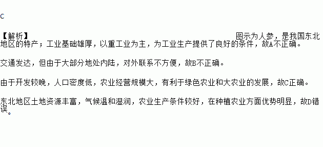 C 【解析】图示为人参,是我国东北地区的特产;工业基础雄厚,以重工业为主,为工业生产提供了良好的条件,故A不正确。 交通发达,但由于大部分地处内陆,对外联系不方便,故B不正确。 由于开发较晚,人口密度低,农业经营规模大,有利于绿色农业和大农业的发展,故C正确。 东北地区土地资源丰富,气候温和湿润,农业生产条件较好,在种植农业方面优势明显,故D错误。