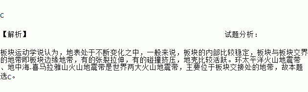 C ¡¾½âÎö¡¿ÊÔÌâ·ÖÎö£º °å¿éÔ˶¯Ñ§ËµÈÏΪ£¬µØ±í´¦ÓÚ²»¶Ï±ä»¯Ö®ÖУ¬Ò»°ãÀ´Ëµ£¬°å¿éµÄÄÚ²¿±È½ÏÎȶ¨£¬°å¿éÓë°å¿é½»½çµÄµØ´ø¼´°å¿é±ßÔµµØ´ø£¬ÓеÄÕÅÁÑÀÉ죬ÓеÄÅöײ¼·Ñ¹£¬µØ¿Ç±È½Ï»îÔ¾¡£»·Ì«Æ½Ñó»ðɽµØÕð´ø¡¢µØÖк£-ϲÂíÀÑÅɽ»ðɽµØÕð´øÊÇÊÀ½çÁ½´ó»ðɽµØÕð´ø£¬Ö÷ҪλÓÚ°å¿é½»½Ó´¦µÄµØ´ø£¬¹Ê±¾ÌâÑ¡C¡£