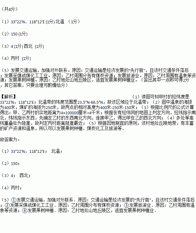 (5)某学校初中地理课外兴趣小组到乙村及周围进行地理野外考察,发现乙村周围资源丰富,但经济比较落后。为发展经济,你认为该村可优先发展何种产业?并说明理由。