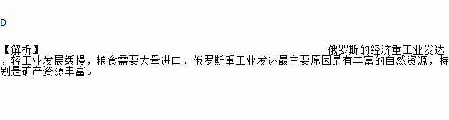 D 【解析】俄罗斯的经济重工业发达,轻工业发展缓慢,粮食需要大量进口,俄罗斯重工业发达最主要原因是有丰富的自然资源,特别是矿产资源丰富。