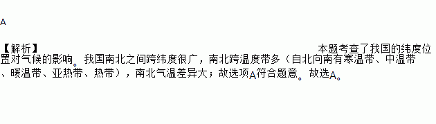 A 【解析】本题考查了我国的纬度位置对气候的影响。我国南北之间跨纬度很广,南北跨温度带多(自北向南有寒温带、中温带、暖温带、亚热带、热带),南北气温差异大;故选项A符合题意。故选A。