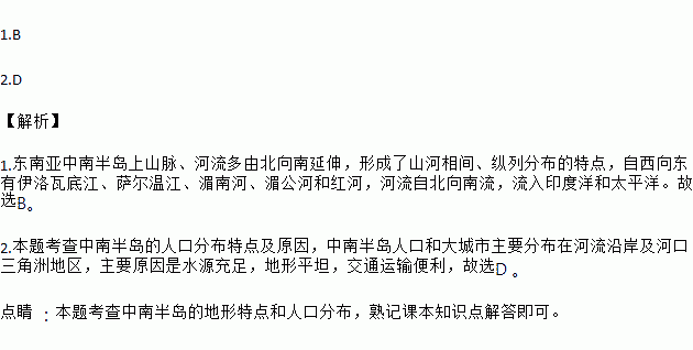 1.B 2.D 【解析】 1.东南亚中南半岛上山脉、河流多由北向南延伸,形成了山河相间、纵列分布的特点,自西向东有伊洛瓦底江、萨尔温江、湄南河、湄公河和红河,河流自北向南流,流入印度洋和太平洋。故选B。 2.本题考查中南半岛的人口分布特点及原因,中南半岛人口和大城市主要分布在河流沿岸及河口三角洲地区,主要原因是水源充足,地形平坦,交通运输便利,故选D 。 点睛 :本题...