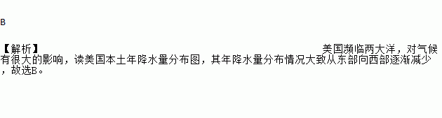 B ¡¾½âÎö¡¿ÃÀ¹ú±ôÁÙÁ½´óÑó£¬¶ÔÆøºòÓкܴóµÄÓ°Ï죬¶ÁÃÀ¹ú±¾ÍÁÄ꽵ˮÁ¿·Ö²¼Í¼£¬ÆäÄ꽵ˮÁ¿·Ö²¼Çé¿ö´óÖ´Ӷ«²¿ÏòÎ÷²¿Öð½¥¼õÉÙ£¬¹ÊÑ¡B¡£