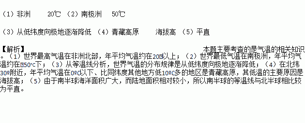 (1)世界最高气温在____洲北部,年平均气温约在___ºC以上。