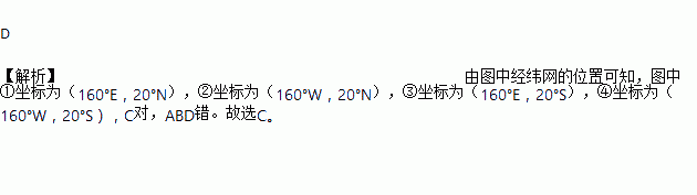 某海上救援队收到一远洋捕捞船的求救信号,得知轮船遇难地点在(20ºS,160ºW)。下面经纬图上表示遇难轮船所在位置的是( )
