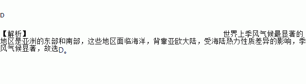 D 【解析】世界上季风气候最显著的地区是亚洲的东部和南部,这些地区面临海洋,背靠亚欧大陆,受海陆热力性质差异的影响,季风气候显著,故选D。
