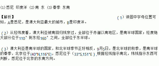 (1)悉尼 印度洋 (2)南 东 (3)春季 东南 【解析】(1)读图中字母位置可知,A是悉尼,是澳大利亚最大的城市,B是印度洋。 (2)从经纬度看,澳大利亚被南回归线穿过,全部位于赤道以南地区,是南半球国家;经度绝大部分位于110°到东经160°之间,全部位于东半球。 (3)澳大利亚是南半球的国家,和北半球季节正好相反,9月5日,是北半球的秋季,是南半球的春季,北京位于(40°...