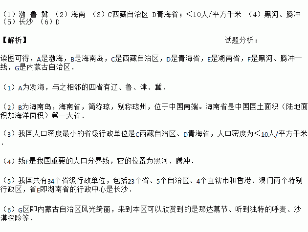 £¨1£©²³ ³ ¼½ £¨2£©º£ÄÏ £¨3£©CÎ÷²Ø×ÔÖÎÇø DÇຣʡ£»£¼10ÈË/ƽ·½Ç§Ã× £¨4£©ºÚºÓ¡¢ÌÚ³å £¨5£©³¤É³ £¨6£©D ¡¾½âÎö¡¿ÊÔÌâ·ÖÎö£º ¶Áͼ¿ÉµÃ£¬AÊDz³º££¬BÊǺ£Äϵº£¬CÊÇÎ÷²Ø×ÔÖÎÇø£¬DÊÇÇຣʡ£¬EÊǺþÄÏÊ¡£¬FÊǺںӡ¢ÌÚ³åÒ»Ïߣ¬GÊÇÄÚÃɹÅ×ÔÖÎÇø£® £¨1£©AΪ²³º££¬ÓëÖ®ÏàÁÚµÄËÄÊ¡ÓÐÁÉ¡¢Â³¡¢½ò¡¢¼½£® £¨2£©BΪº£Äϵº£¬º£ÄÏÊ¡£¬¼ò³ÆÇí£¬±ð³ÆÇíÖÝ£¬Î»ÓÚÖйúÄ϶ˡ£º£ÄÏÊ¡ÊÇÖйú¹úÍÁ...