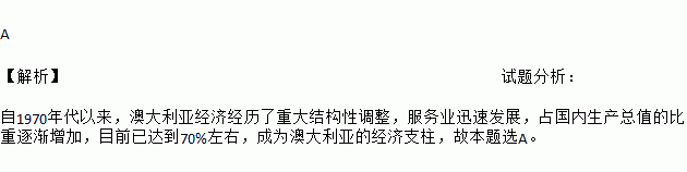 A 【解析】试题分析: 自1970年代以来,澳大利亚经济经历了重大结构性调整,服务业迅速发展,占国内生产总值的比重逐渐增加,目前已达到70%左右,成为澳大利亚的经济支柱,故本题选A。