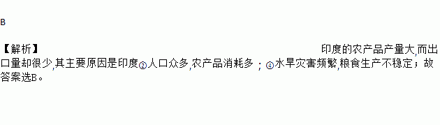 B ¡¾½âÎö¡¿Ó¡¶ÈµÄÅ©²úÆ·²úÁ¿´ó,¶ø³ö¿ÚÁ¿È´ºÜÉÙ,ÆäÖ÷ÒªÔÒòÊÇÓ¡¶È¢ÚÈË¿ÚÖÚ¶à,Å©²úÆ·ÏûºÄ¶à£»¢ÜË®ºµÔÖº¦Æµ·±,Á¸Ê³Éú²ú²»Îȶ¨£»¹Ê´ð°¸Ñ¡B¡£