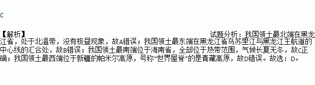 C. 我国领土最南端气候长夏无冬 D. 我国领土最西端号称“世界屋脊”