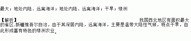 最大;地处内陆、远离海洋;地处内陆、远离海洋;干旱;绿洲 【解析】我国西北地区有面积最大的省区-新疆维吾尔自治,由于其深居内陆,远离海洋,主要是温带大陆性气候,特点干旱,由此形成富有特色的绿洲农业。